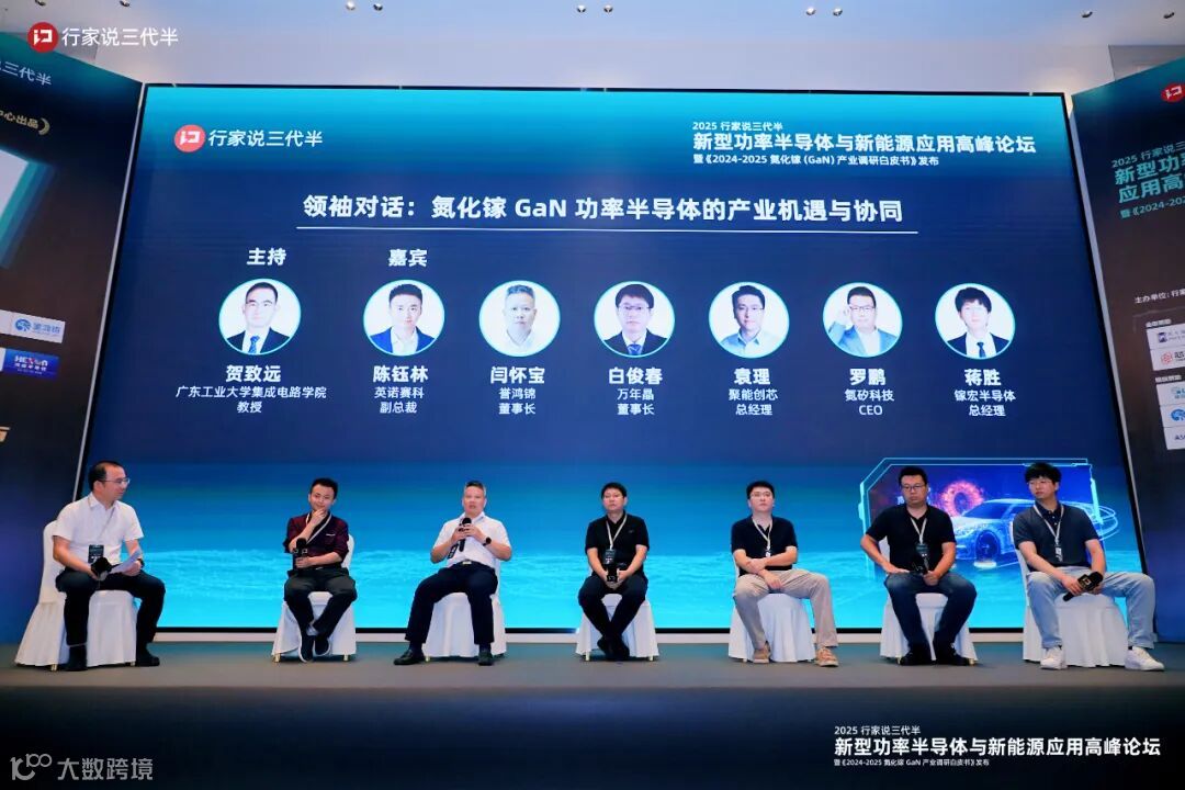 除了现场的主题报告外,本次会议最瞩目的环节当属2场对话论坛,其中“领袖对话”环节邀请到了英诺赛科副总裁陈钰林、誉鸿锦董事长闫怀宝、万年晶董事长白俊春、聚能创芯总经理袁理、氮矽科技CEO罗鹏、镓宏半导体总经理蒋胜等六位行业大咖,分享氮化镓行业现状与趋势观点。
