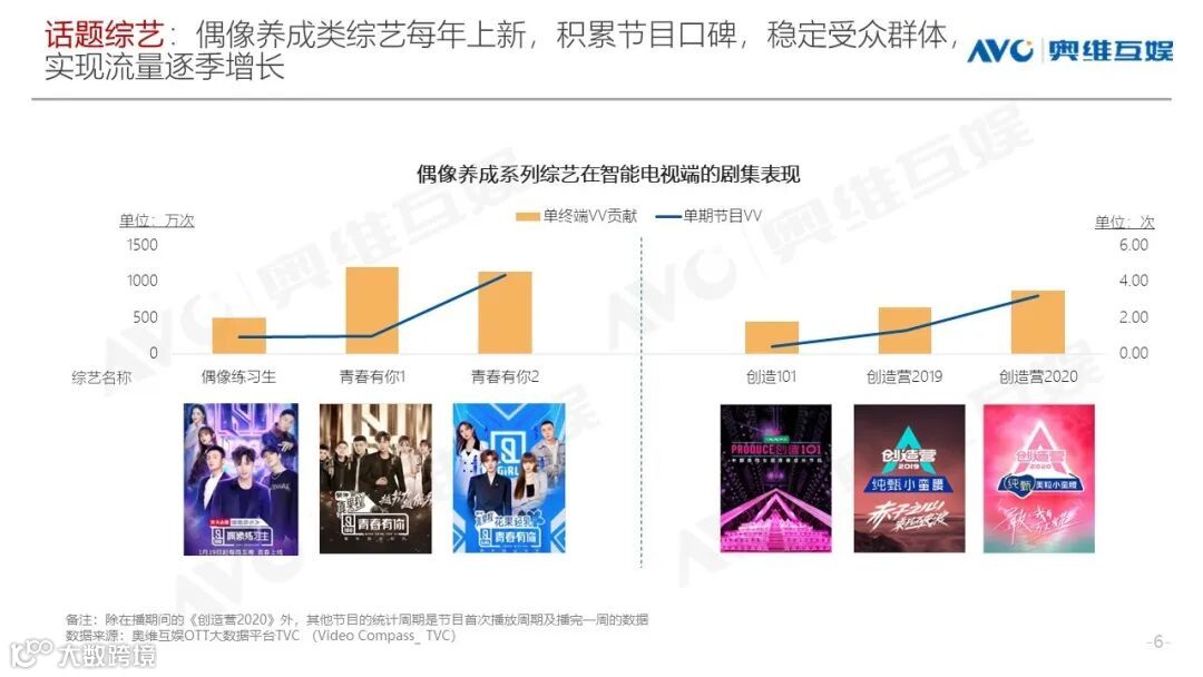 选秀类综艺纵向垂直化,发展路径为素人选秀到偶像养成(团队出道)。偶像养成类综艺既有传统素人选秀节目的选拔淘汰特征,同样也把准了年轻用户的喜好心理、结合时下流行的粉丝文化,着力打造热点人物、不断引出新的社交话题,形成流量效应,迅速扩散传播。偶像养成类综艺每年季播,具备历史积累的口碑和稳定的受众群体,一旦年度上新,会迅速带来收看流量。