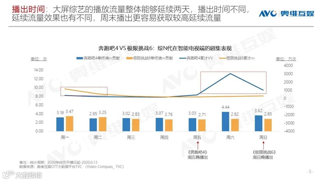 大屏综艺的播放流量整体能够延续两天,播出时间不同,延续流量效果也有不同。对比《奔跑吧4》和《极限挑战6》在大屏的播放表现,《奔跑吧4》周五晚播出,延续收看流量持续整个周末,更容易获取较高延续流量。