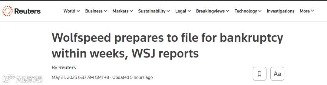 5月20日,《华尔街日报》发文称,据知情人士透露,由于这家上市芯片元件制造商难以解决巨额债务问题,Wolfspeed准备在几周内申请破产。