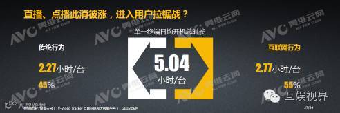 同时,李晔指出,在互联网电视终端,用户收看时长的配比已经向互联网点播行为开始倾斜。数据显示,单一终端点播行为花费时长2.77小时,比传统直播行为时长高出0.5小时。互联网点播行为抢占了用户在电视终端的时间,形成了用户时间争抢拉锯战。
