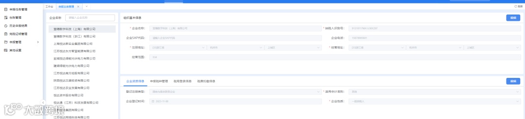 慧穗云纳税申报业务对接企业前端系统,自动采集获取税务基础数据,并通过税金计算引擎、税基台账管理引擎、工作底稿与申报表管理引擎等核心智能化技术引擎,实现符合我国税收管理特点,可自定义配置化管理的全税种、全过程、线上化、自动化的纳税申报管理功能,帮助大型集团企业通过一套系统达到“集中算税、一键算税、一键报税”的申报集中化、共享化管理目标。