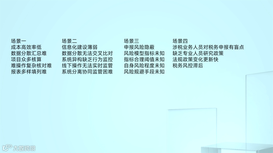 通过流程拉通、内控优化、行业指标等几个方面设定指标与阀值,对全税种的各类风险进行实时动态监控,利用大数据分析防控风险。
