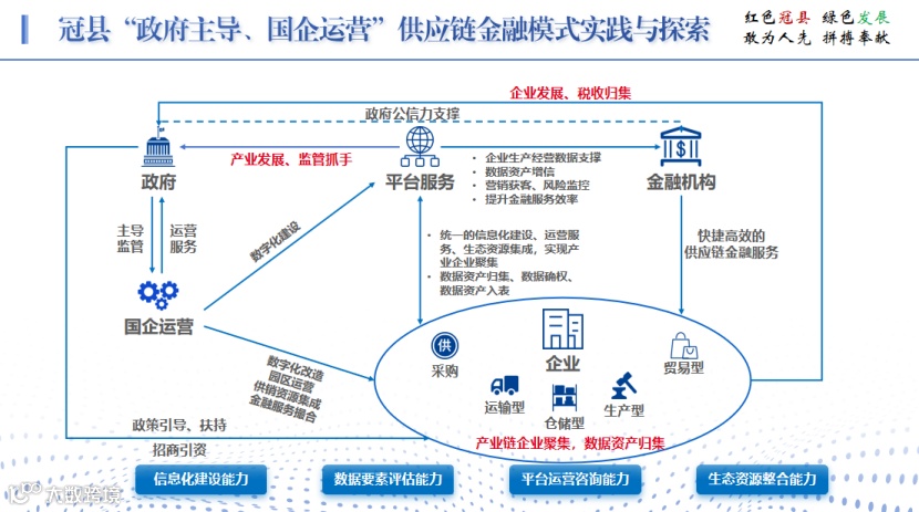 山东冠县的实践证明,供应链金融不是金融机构的专利,也不是大型核心企业的专属。在“政府主导、国企运营”模式的指导下,地方国企完全有能力、有路径成为连接政府、银行、企业的关键桥梁,从一个资金搬运工转变为产业供应链生态组织者。