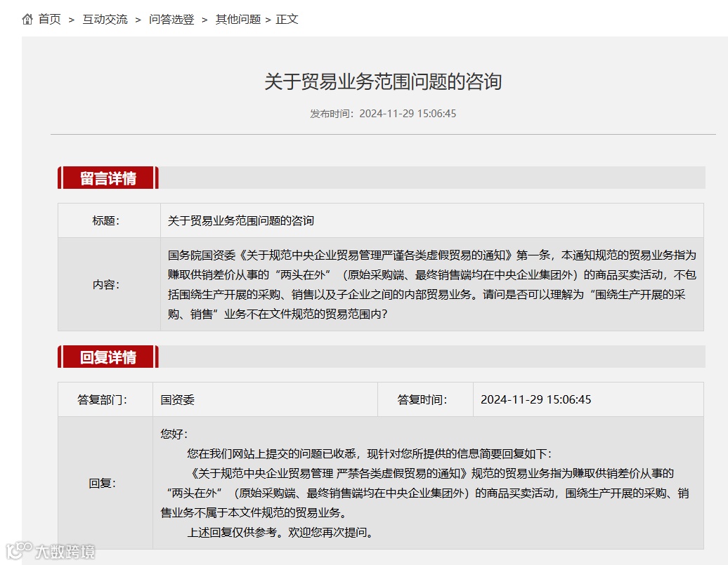 《关于规范中央企业贸易管理 严禁各类虚假贸易的通知》规范的贸易业务指为赚取供销差价从事的“两头在外”(原始采购端、最终销售端均在中央企业集团外)的商品买卖活动,围绕生产开展的采购、销售业务不属于本文件规范的贸易业务。