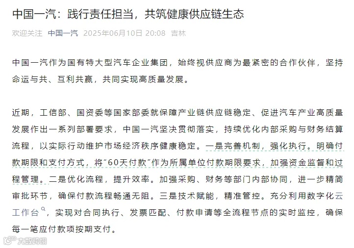 6月10日晚,中国第一汽车集团有限公司、东风汽车集团有限公司、广州汽车集团股份有限公司三大国有巨头率先表态,明确将60天付款写入制度红线,严控账期,保障供应链资金流通。