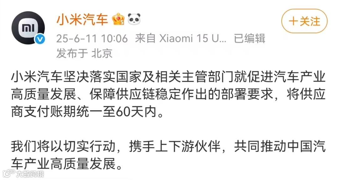 小米汽车官微发布消息称,坚决落实国家及相关主管部门就促进汽车产业高质量发展、保障供应链稳定作出的部署要求,将供应商支付账期统一至60天内;将以切实行动,携手上下游伙伴,共同推动中国汽车产业高质量发展。