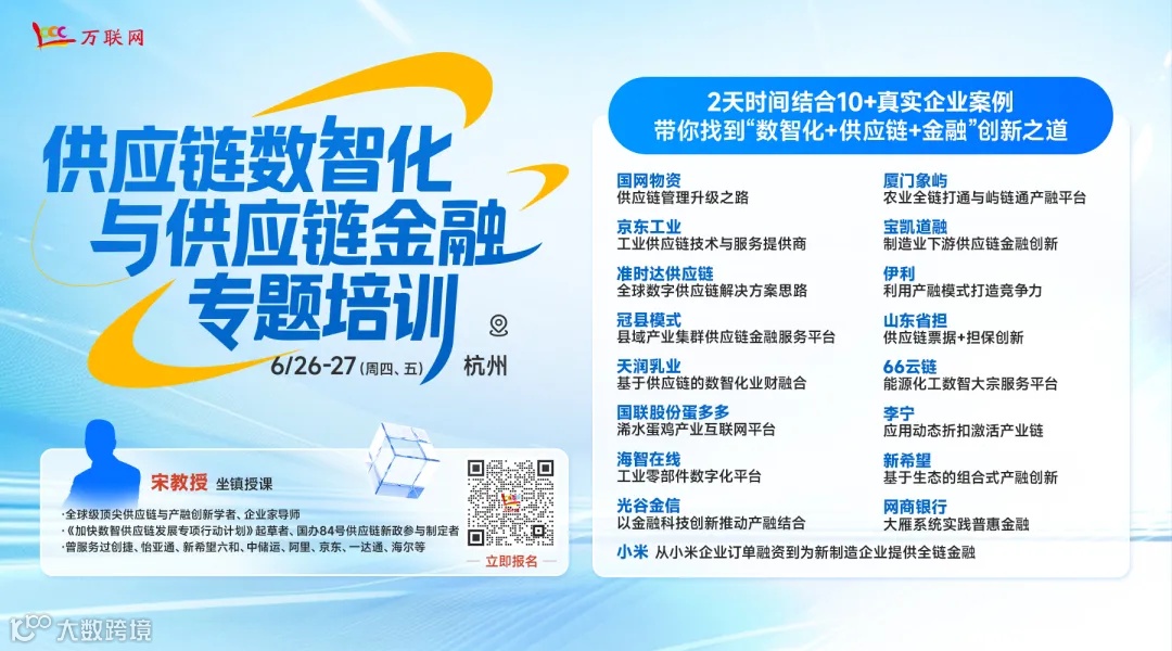 作为该文件的起草参与者、世界级顶尖供应链与产融创新学者、企业家导师【宋教授】,将于6月26-27日亲临杭州坐镇《供应链数智化与供应链金融专题培训》,结合10多个亲身调研及深度走访的企业实践,案例包括不少国企尤为关注的山东冠县由政府主导+国企运营的【“冠之链”供应链金融服务平台】,上线一年成功放款5.5亿,助力冠县区域内的钢板、轴承链上的中小企业融资成本直降50%;湖北浠水以政企合作搭建【蛋鸡产业互联网平台】,一年实现蛋鸡产业链总产值达102亿元,成为湖北浠水的新名片;【海智在线】通过构建工业零部件数字化平台,助力国内70万中小零部件加工企业,对接全球107个国家的20万买家完成零部件及产品的采购,真正助力中国制造走向全球;【厦门象屿】通过建设“屿链通”数字供应链服务平台,实现资金方与客户需求的有效对接,仅2024年该平台授信规模 137 亿,客户年用信规模约36 亿,同比增长超 30%;【国家电网】以绿色现代数智供应链建设为统领,聚焦物资供应全过程,充分发挥产业链供应链“链主”作用;