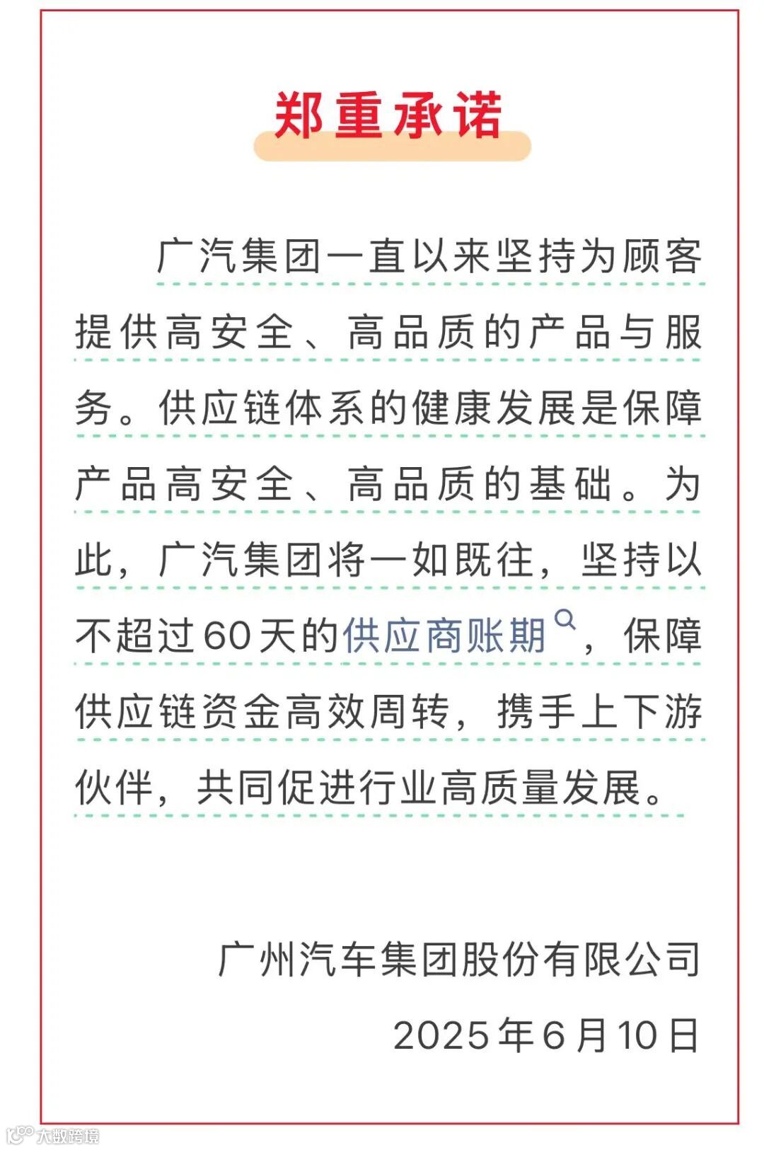 广汽集团表示,供应链体系的健康发展是保障产品高安全、高品质的基础。为此,广汽将一如既往,坚持以不超过60天的供应商账期,保障供应链资金高效周转,携手上下游伙伴,共同促进行业高质量发展。