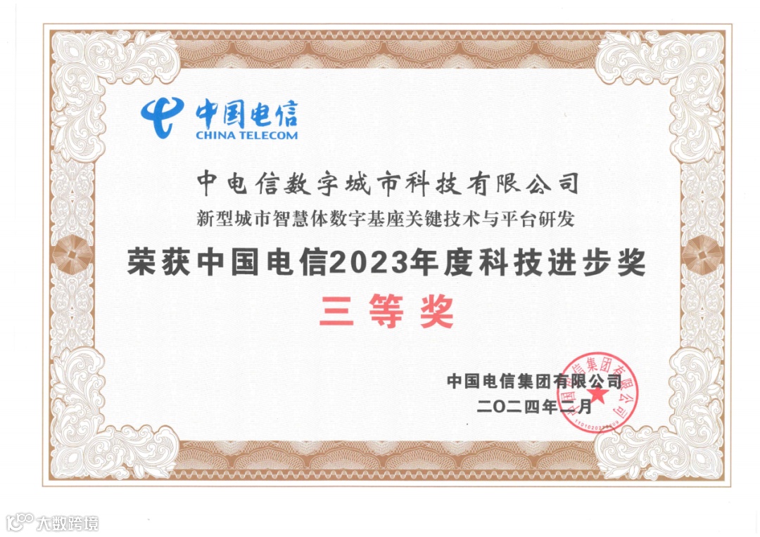 近期,中电信数城科技公司“新型城市智慧体数字基座关键技术与平台研发”项目荣获中国电信集团2023年度科技进步奖三等奖。本次奖项评选由中国电信集团公司举办,重点鼓励核心技术自主掌控及成果落地应用对企业发展创造了重要价值的科技项目,旨在发挥科技奖励对科技创新的导向作用。