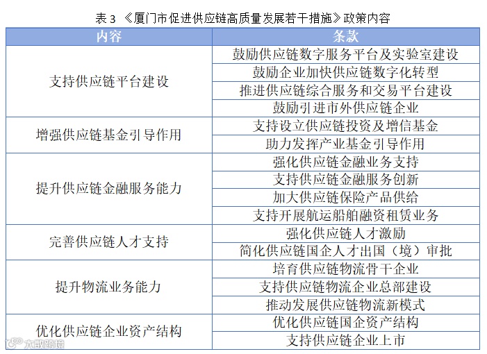 (4)提升供应链质量:《厦门市促进供应链高质量发展若干措施》。2022年7月出台《措施》,包括6大方向,给出了17项政策条款。