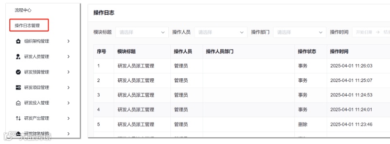 此外,还通过操作日志前台管理,实现了研发活动全链条的系统完整留痕与快速核查。