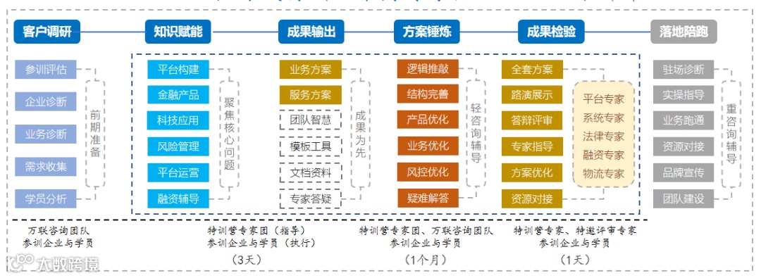 供应链金融团队特训营(产互平台构建与运营专题)是针对产互平台类型企业设计的,以老板+板块负责人5人成团形式,通过3天2夜集中式的教练式辅导+1个月的专家导师团陪跑+1天方案评审路演,帮助企业团队打造出针对自己平台的供应链金融解决方案,包括商业模式、平台、产品、风控、融资、系统等的全套解决方案,并提供系统匹配、资金对接等服务,聚焦方案出炉、落地实施。