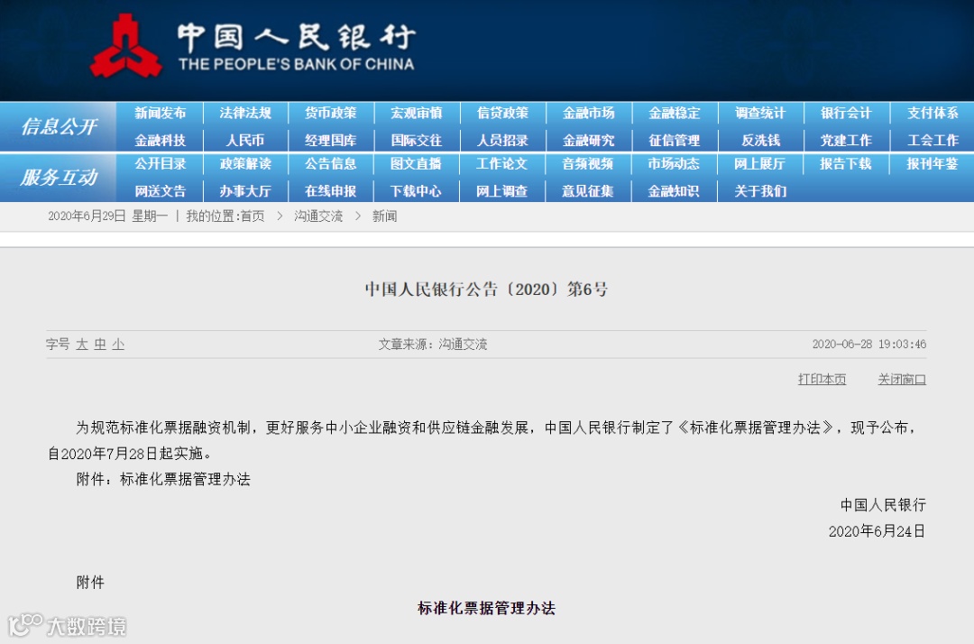 6月28日晚,中国人民银行在其官网发布了“中国人民银行公告〔2020〕第6号”,发布《标准化票据管理办法》(以下简称《管理办法》)正式稿。