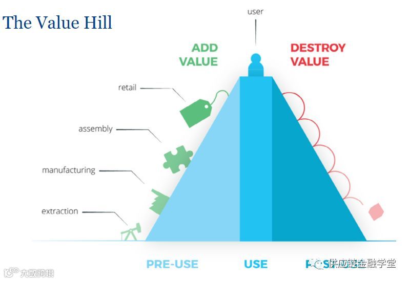 接下来介绍一些循环经济的基本概念,比如价值坡度(Value Hill)的变化。也就是资源从开采到生产、组装、零售,最后卖到消费者手中的过程是价值增加的过程,随后它的价值会在消费者使用后不断减少。