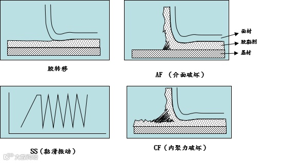 按照室温标准试验条件时,不同的胶黏剂配方上可以观察到上面的各种破坏模式。然而而在不同的试验温度、剥离速度和剥离角度下,也可能在同一个配方上观察到这些不同的破坏模式。