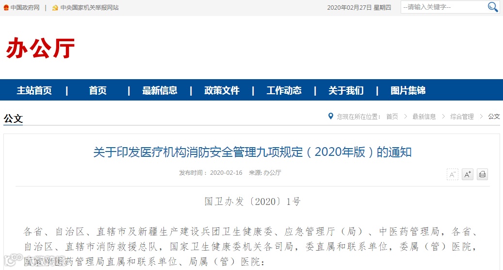 为深入贯彻落实党中央、国务院领导同志关于消防工作的一系列指示批示精神及消防安全法律法规、行业标准,进一步明确医疗机构消防安全管理工作的重点和措施,2015年,原国家卫生计生委、公安部、国家中医药管理局联合印发了《医疗机构消防安全管理九项规定》(以下简称《九项规定》)。根据机构改革职能调整和新形势下医疗机构消防安全管理工作需要,国家卫生健康委、应急管理部、国家中医药管理局联合对《九项规定》进行了修订。现将《医疗机构消防安全管理九项规定(2020年版)》印发给你们,请结合实际认真贯彻落实,广泛宣传,督促指导医疗机构遵照执行。