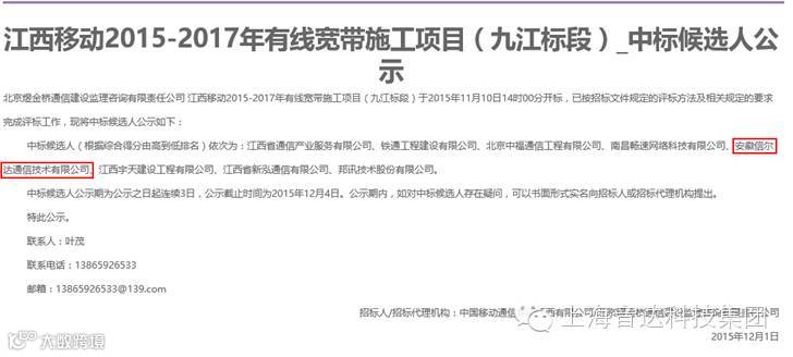 2015年12月1日,江西移动的招标活动尘埃落定。安徽信尔达凭借良好的信誉、强大的技术实力以及优秀的方案、完善的质量和进度保证体系顺利中标!结果如下: