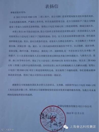信中对诺基亚团队圆满完成江口电信三期FDD LTE项目工程表示高度的认可和诚挚的感谢!并特别指出江口县诺基亚服务人员吴普牒在项目过程中展现的过硬的技术水平、良好的沟通能力和取得的卓越成绩。