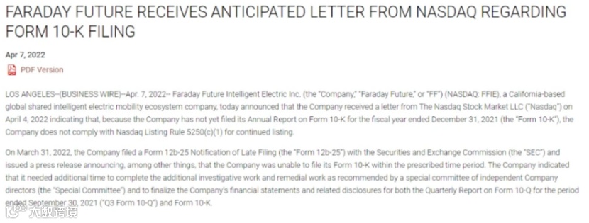 值得注意的是,4月8日,电动汽车公司法拉第未来收到纳斯达克股票交易所发出的通知,称其延迟提交10-K报表的做法不符合继续上市的规定。纳斯达克股票交易所表示,如果法拉第未来想继续上市,交易所希望公司在4月19日之前达到合规标准。