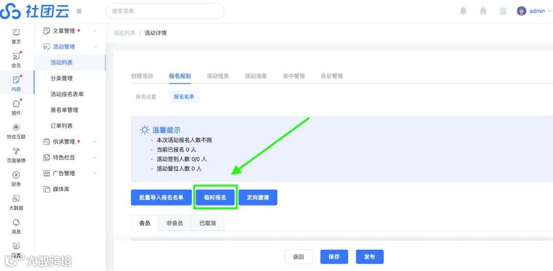 秘书处在后台创立活动之后,点击「内容」-「活动列表」-选择某个活动的「报名名单」进入到活动报名页。