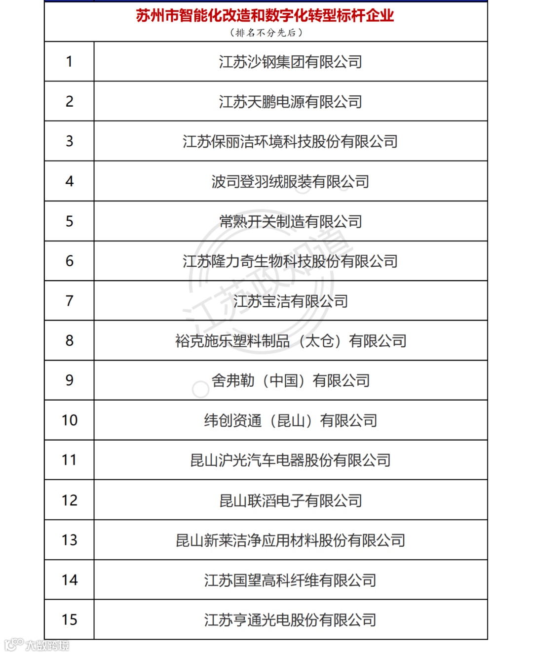 为深入贯彻全市数字经济和数字化发展推进大会精神,认真落实《关于推进制造业智能化改造和数字化转型的若干措施》要求,学习标杆,激励典型,全市开展了智能化改造和数字化转型标杆企业和优秀服务商评选工作。经各地申报,市工信局组织评选,市政府决定命名江苏沙钢集团有限公司等 30 家单位为“苏州市智能化改造和数字化转型标杆企业”,命名江苏腾瑞智联数字科技有限公司等 20 家单位为“苏州市智能化改造和数字化转型优秀服务商”。