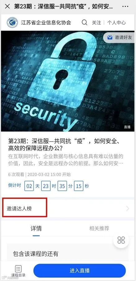 以第23期课程为例,首先识别第23期课程海报中的二维码,进入课程直播间,点击右上角的“邀请好友”图标,获取属于自己的邀请海报。(如图1)