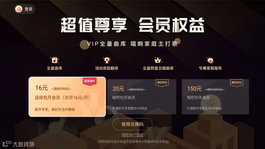 图为唱吧会员付费页面(不包含移动端应用会员权益)