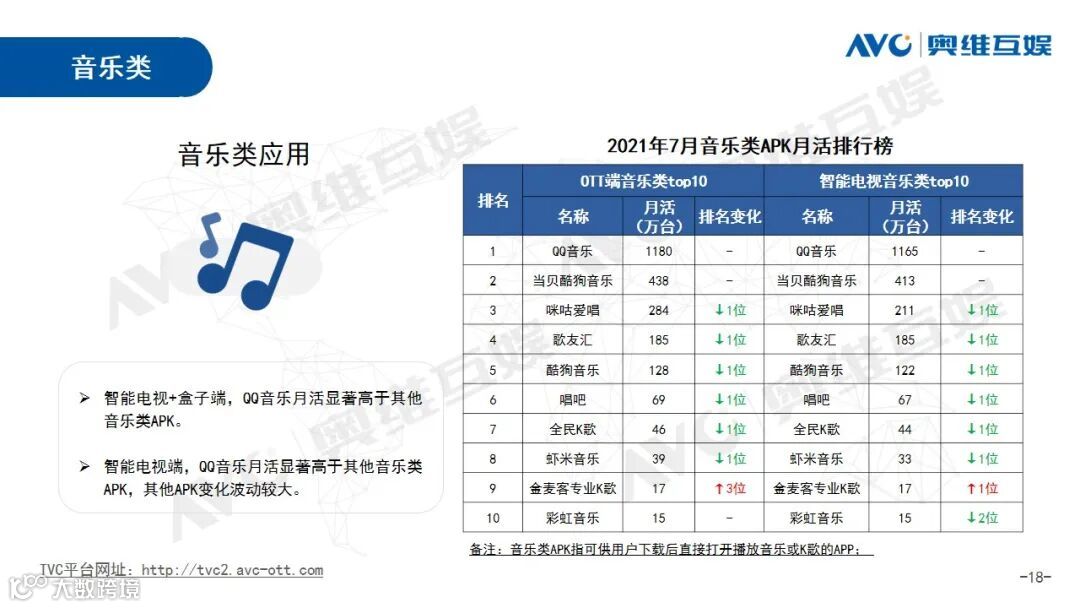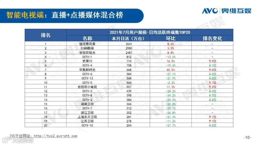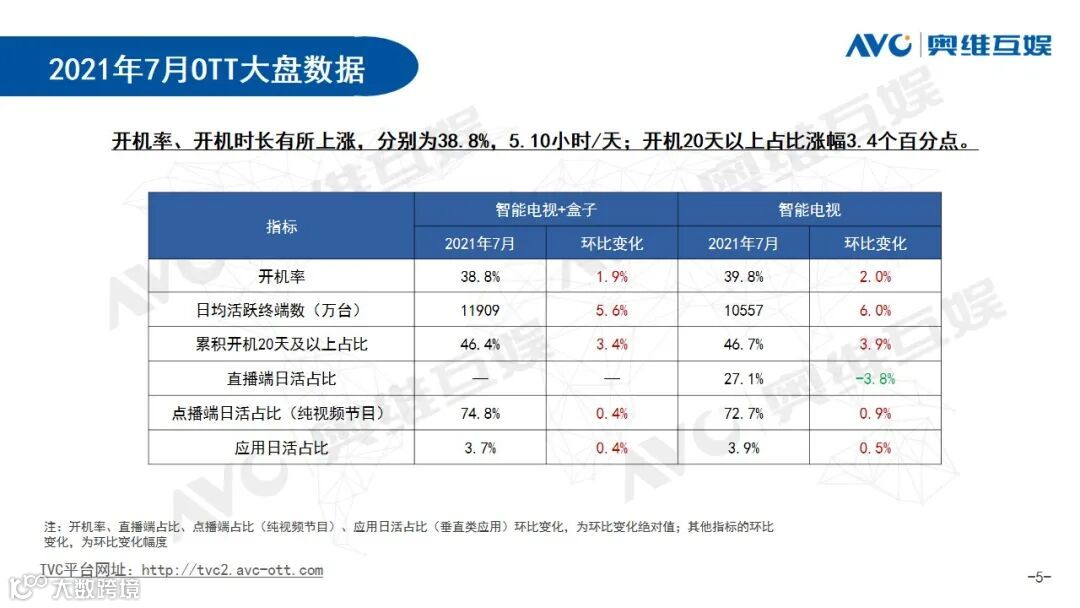 根据奥维互娱2021年7月大屏端整体数据显示,OTT日活规模11909万台,环比上涨5.6%; OTT端开机率上涨1.9个百分点;点播排行榜,银河奇异果位列第一,日活3958万。