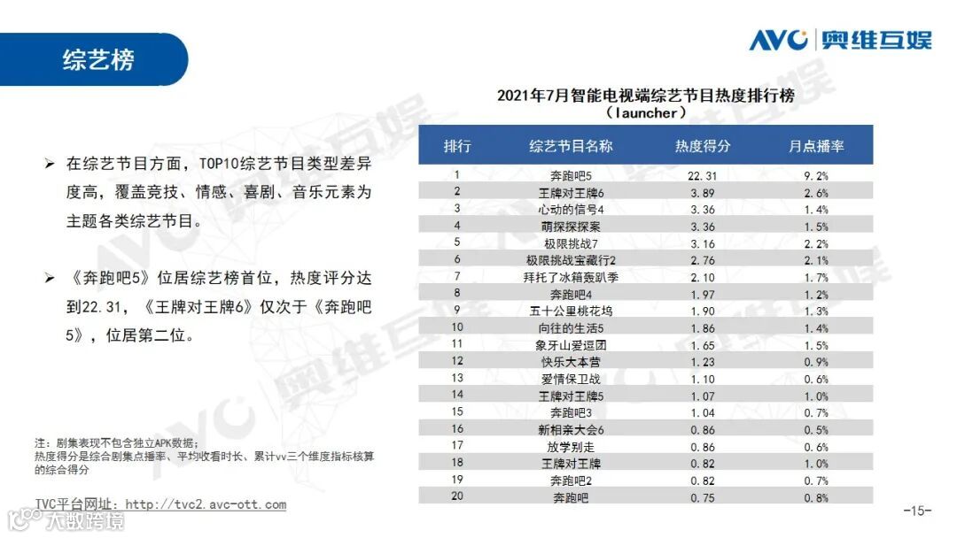 综艺榜:《奔跑吧5》热度评分达到22.31,位居综艺榜首位,且遥遥领先;《王牌对王牌6》位居第二位。