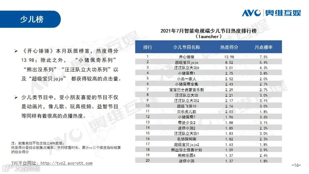 少儿榜:《开心锤锤》本月热度点播双冠军,热度得分13.98。