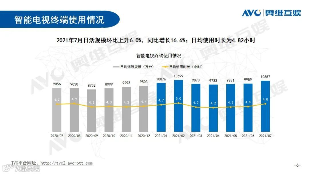 智能电视日活环比上涨6.0%,日均使用时长达4.82小时。