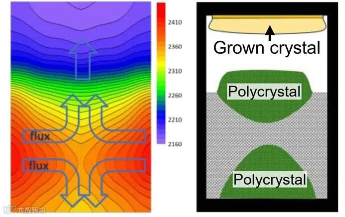 丰田中央研发实验室认为,感应炉的典型缺点是会产生热-电失控现象,即在粉料石墨坩埚的侧壁形成热点,进而在粉料区产生陡峭的非预期温度梯度(图1左)。这些梯度会在石墨坩埚的底部或粉料区的顶部形成粗大的多晶(图 1右),最终降低粉料的利用率,使得SiC晶体厚度无法提高。