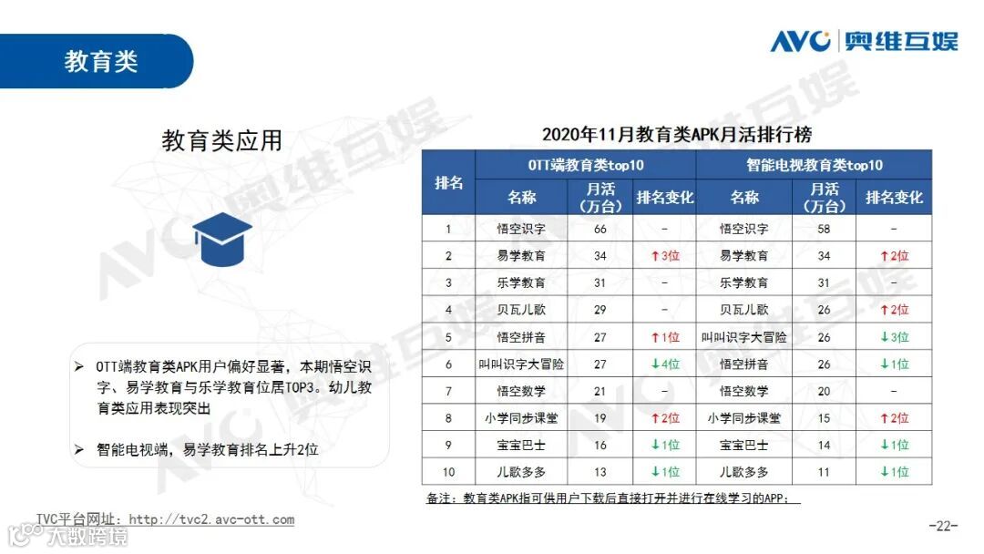教育类应用排行榜,OTT端悟空识字、易学教育与乐学教育位居TOP3。