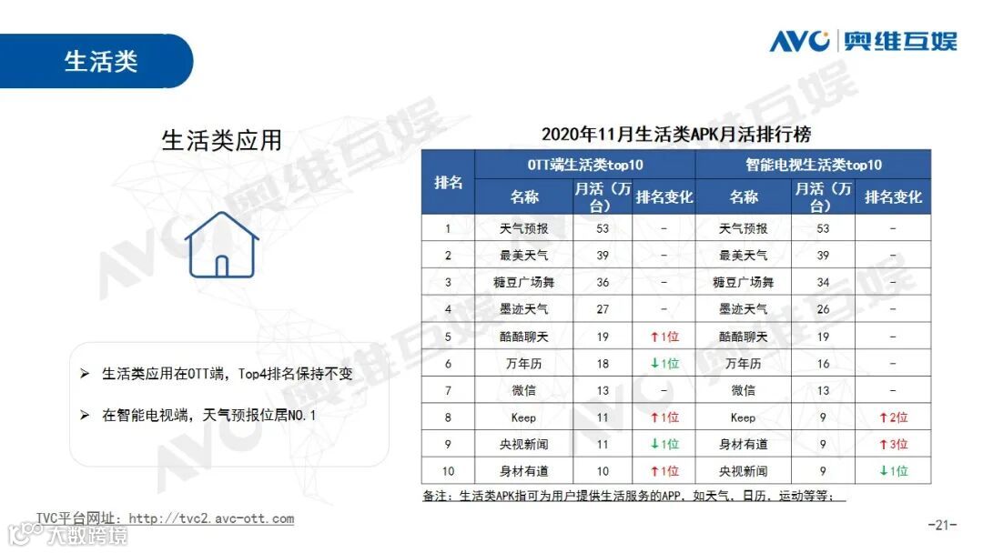 生活类应用排行榜,天气类APK拥有较高活跃,在排行榜中占据三席。