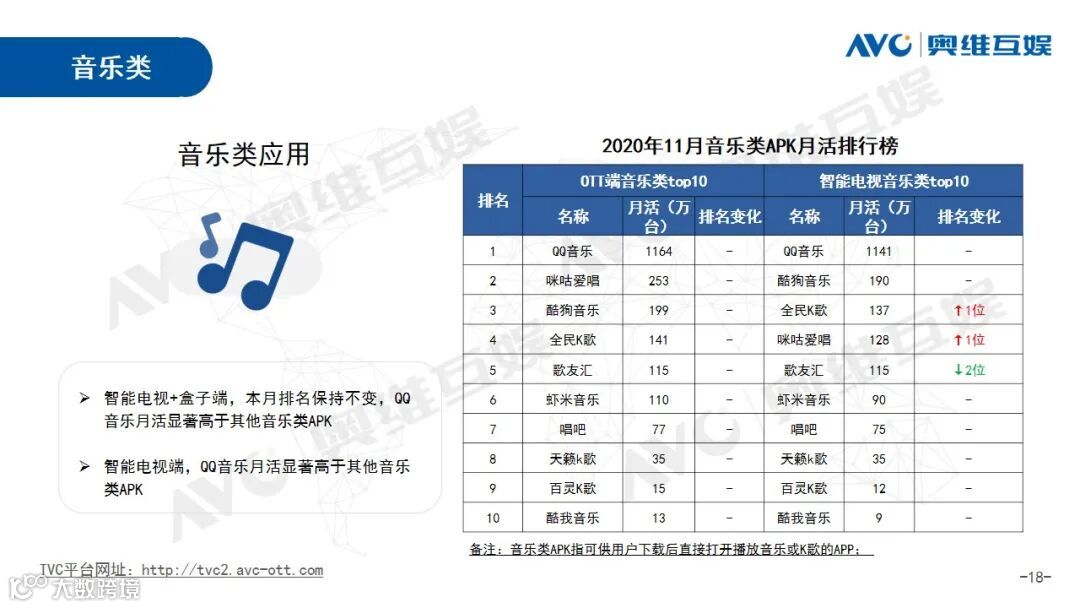根据奥维互娱2020年11月大屏端整体数据显示,OTT日活规模10675万台,环比上涨2.6%; OTT端开机率上涨1.0个百分点;点播排行榜,银河奇异果位列第一,日活3514万。