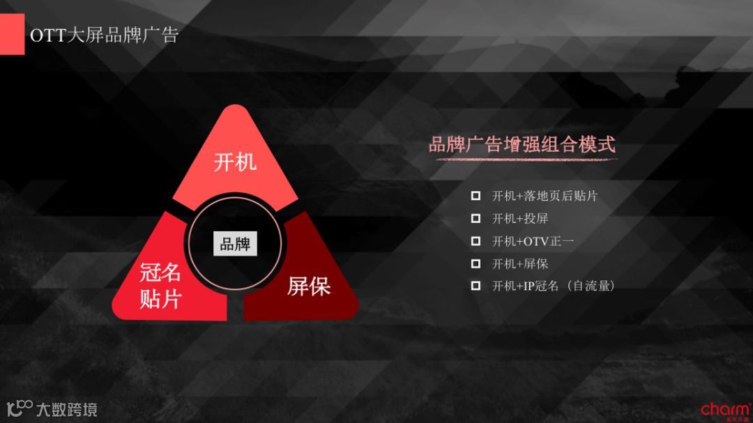 在OTT广告实际投放中,品牌广告双连播增强播放模式可以实现更好品牌传播。核心的五大模式是:开机+落地页后贴片、开机+投屏、开机+OTV正一、开机+屏保、开机+IP冠名(自流量)。