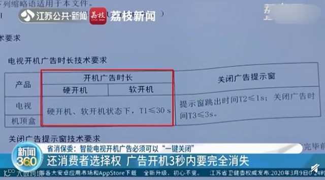 今年3月10日,中国电子商会组织下,江苏省消费者权益保护委员会、深圳市消费宝网络科技有限公司提出并牵头起草的《智能电视开机广告技术规范(征求意见稿)》对外发布。《意见稿》指出,智能电视的开机广告时长不得超过30秒,自播出起就能一键关闭,3秒内关闭响应完毕。