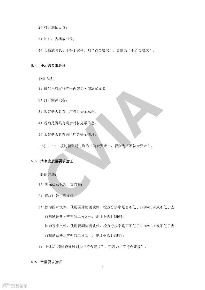 同时,为了保障用户体验,标准对智能电视开机广告的服务获取条件、启播时限、播放时长、广告提示、剩余时长提示、关闭能力,以及对广告内容的合法性、有效性、流畅度、清晰度、最大音量等方面都提出了明确要求,并在标准中提供了验证方法。