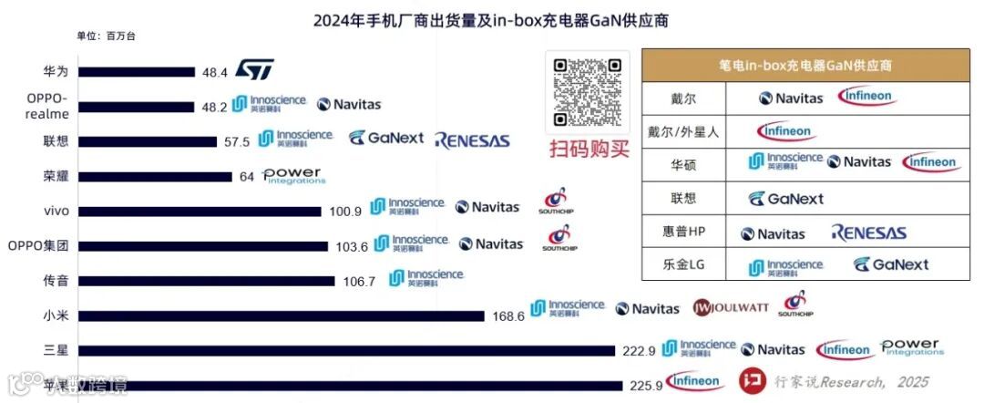 行家说Research调研显示,苹果、三星、小米、传音、VIVO、华为等手机销量前十的手机品牌都在in-box PD快充中导入了氮化镓技术。