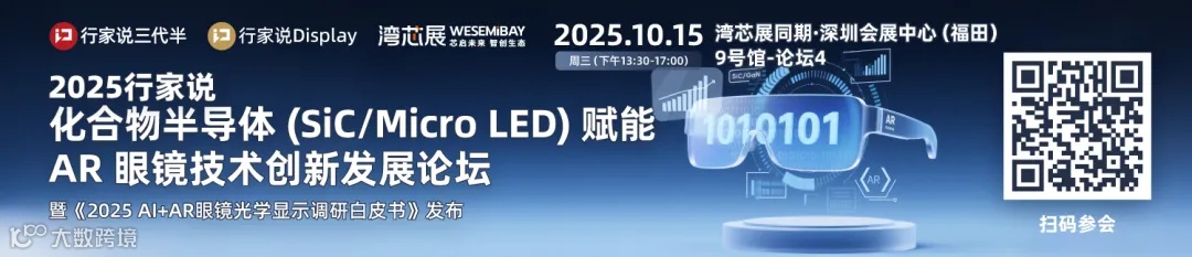 在此背景下,行家说将于10月15日在深圳举办“化合物半导体(SiC/Micro LED)赋能AR眼镜技术创新发展论坛”。本次大会将汇集AR眼镜行业专家与产业链代表,聚焦SiC光波导与Micro LED微显示器的技术瓶颈与市场前景,助推AR眼镜产业链协同创新。