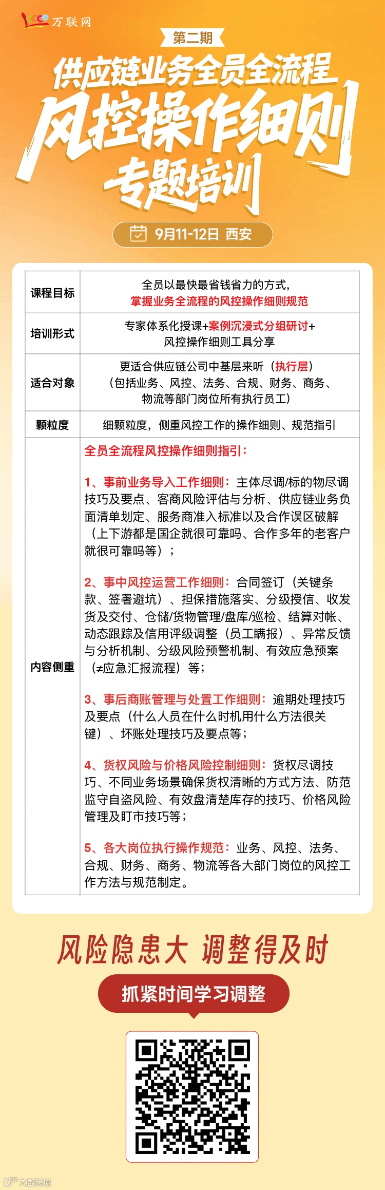 为啥这堂课这么火爆?因为该课程,不是泛泛而谈风控概念、风控体系构建,而从操作细则的细微视角,给大家讲解供应链业务全流程、全员的风控工作方法与规范,助力各大国企能以最快速、最省钱、最省力的方式,排查自身供应链业务上的合规与风险点,同时课后能制定或完善自己的供应链全流程风控操作细则,让所有与风控有关的工作人员,包括业务、风控、法务、合规、财务、商务、物流等岗位,在每个场景中明晰自己该干啥、该看啥、该注意啥、该操作啥,实现精细化运营,切实防控原来粗放运营下潜藏的巨大风险,确保该拿下的业绩拿下,也不怕真出风险,因为这些做到了,即使出风险也能尽力免责......