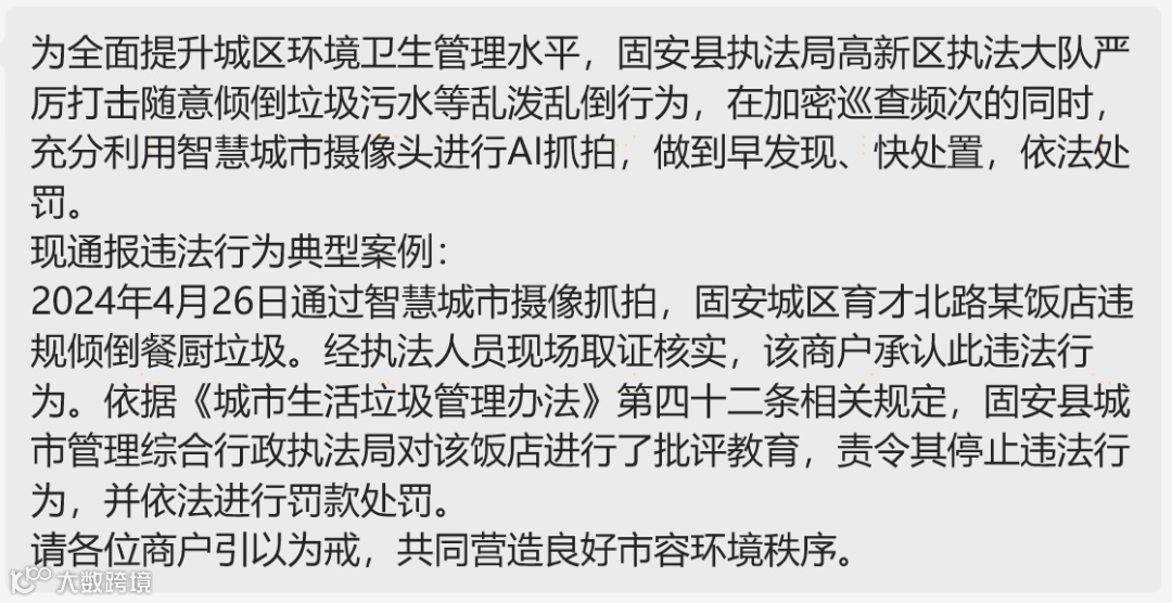 民以食为天,餐饮是最贴近老百姓生活的行业之一,随之产生的大量餐厨垃圾如何正确处理也事关老百姓的生活品质。为解决城市餐厨污水违规倾倒问题,近日,中电信数城科技公司运用AI技术,对餐厨污水乱倒等违规行为进行监测、抓拍和告警,为城市环境卫生管理提供技术支撑。