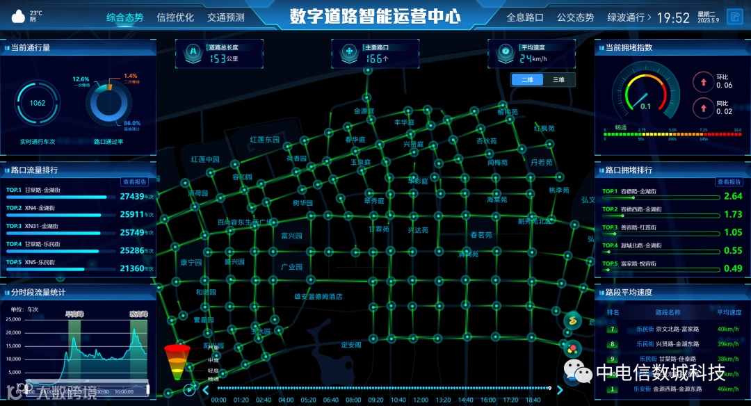 各路口排队车辆数量、预计通行时间、公交客流情况……在数字道路智能运营中心上,大屏幕上实时显示着综合交通信息,区域整体交通状况一览无余。在未来,中电信数字城市科技有限公司数字道路智能运营中心将发挥自身科技和资源优势,不断完善应用场景,助力道路交通建设向数字化、智能化转型,提高城市交通管理水平和人民出行效率。