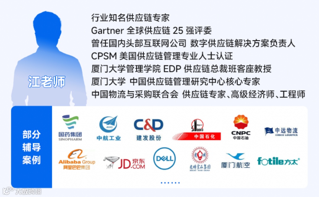 授课专家:江老师 行业知名供应链专家、Gartner全球供应链25强评委、曾任国内头部互联网公司数字供应链解决方案负责人