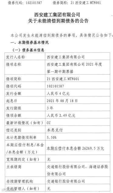 8月19日,西安建工公告称,因受宏观环境、行业下行及地产调控等因素叠加影响,目前公司应收账款回款滞后导致缺乏流动性资金,债券偿付压力较大,未能于2024年8月19日完成“21西安建工MTN001”本息的兑付。截止2024年8月19日,公司未兑付本息合计2.63亿元。构成实质违约。