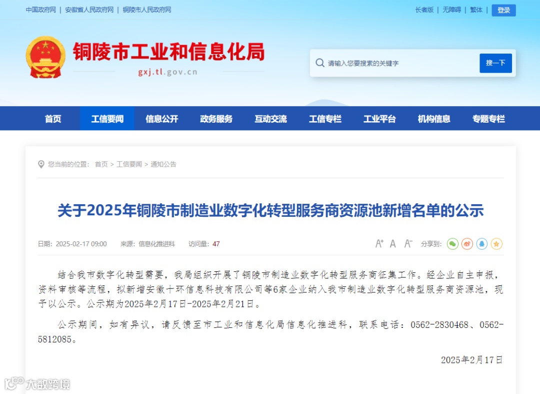 近日,铜陵市工业和信息化局发布了《关于2025年铜陵市制造业数字化转型服务商资源池新增名单的公示》,拟新增6家企业纳入铜陵市制造业数字化转型服务商资源池,安徽数字引力成功进入此次名单。