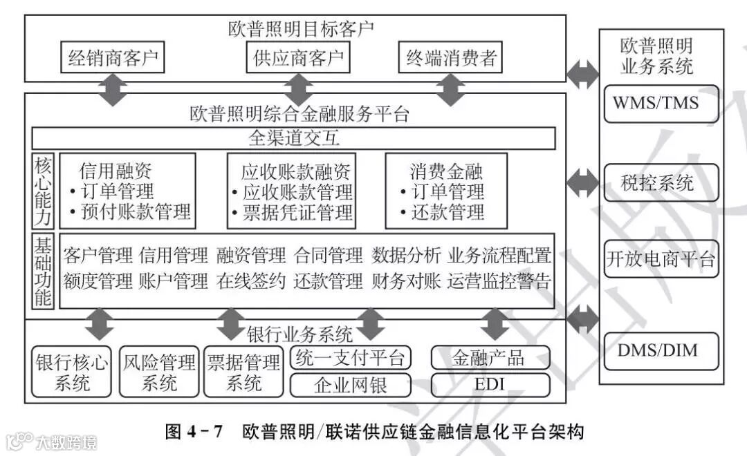 在确定了经销商客户后,便是建设三方协同的智慧供应链金融模式。首先,由联诺构建整合化的互联网信息平台,实现联诺平台与金融机构的系统对接,同时向下游经销商开放接口,经销商能够通过互联网进行访问。此外,联诺平台也能够有效对接欧普的业务系统,提取和整合相关的数据,实现欧普照明、金融机构、经销商三者互联互通(见图4-7)。