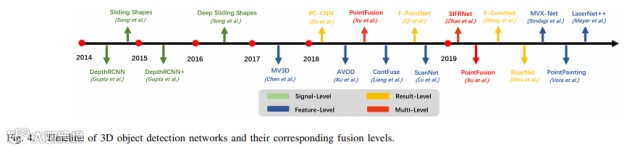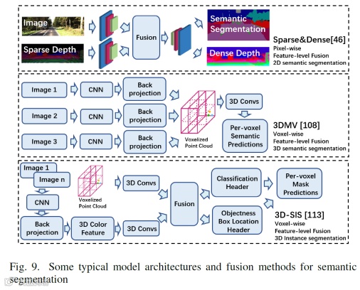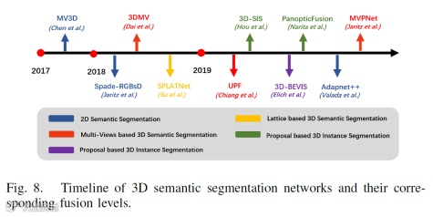 前面已经有了基于检测的融合方法,这里还有基于分割的融合方法,旨在预测每个像素与每个点的类标签。下面两幅图给出了3D语义分割和典型模型架构的时间线。
