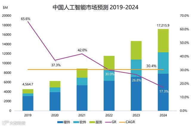 2020年,在数据大爆炸和算力、算法的极大提升下,中国AI资源迎来了爆发式的增长。权威分析机构IDC与浪潮联合发布的《2020-2021中国人工智能计算力发展评估报告》显示,2020年,中国人工智能市场规模是63亿美元,虽然今年受到疫情影响,但中国AI整体市场仍然保持着37%的增长。据IDC预测,到2024年,这个数字将会达到172.2亿美元。